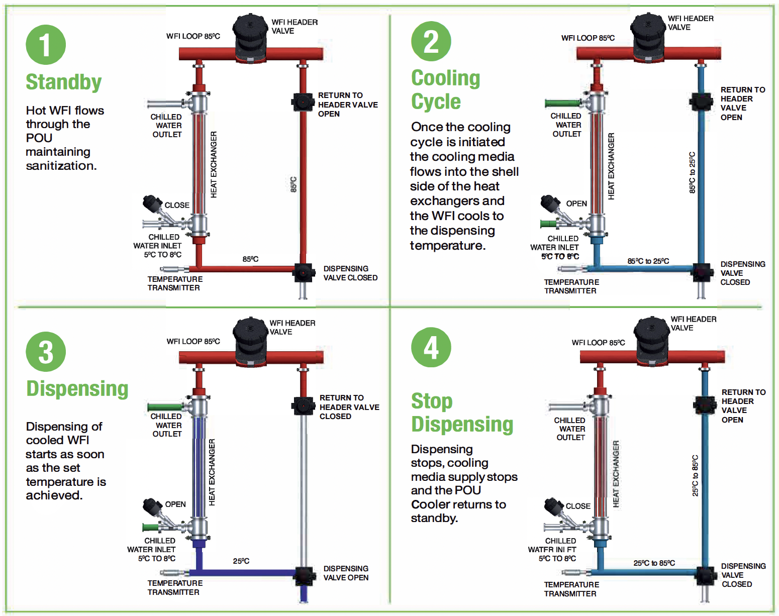 - Cool WFI/PW from 80-85°C to 20-40°C